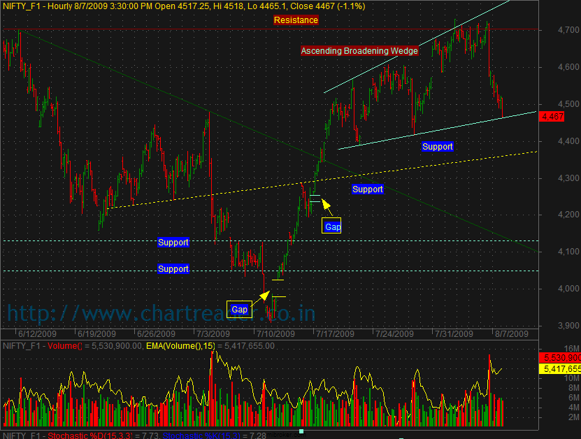 Nifty continued to be bearish on Friday lossing 100 points and also closing at the day's low. But importatntly, Nifty closed almost at the support levels of 4460, which was very crucial for bulls. Now the trading range formed from 24th July to 29th July would become good resistance.