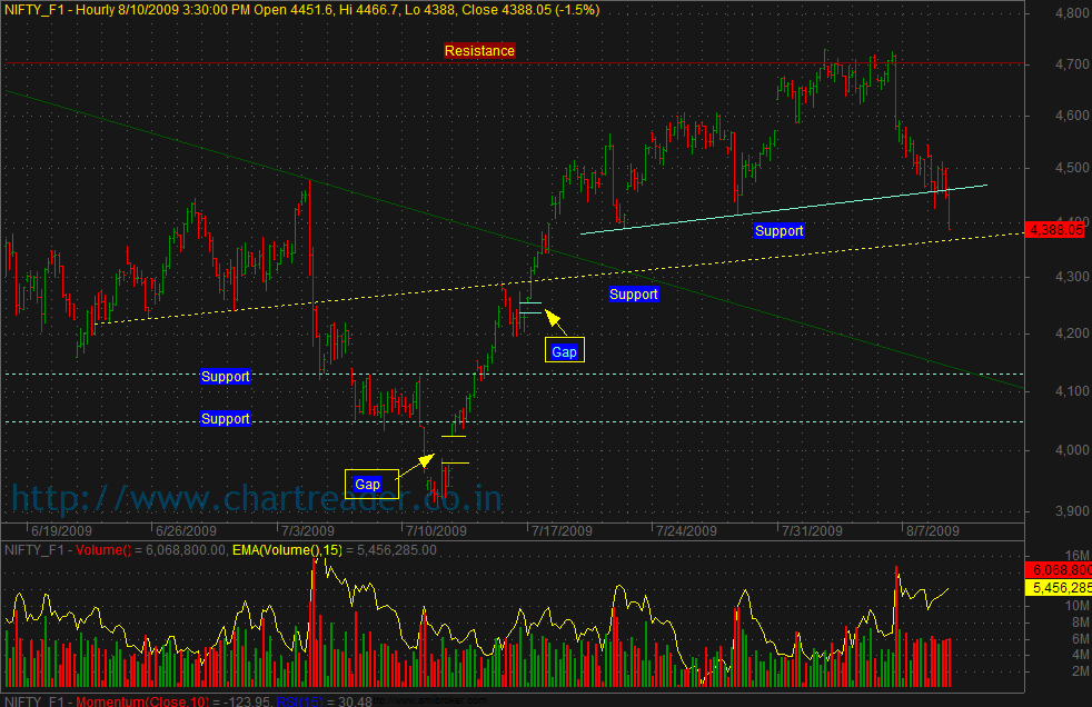 On the lower side yesterdays close of 4388 may give good support as it was a previous pivotal support. Below which the yellow line which acted as support resistance in the earlier cases may give good support at present it is at 4370 levels. Next support comes at 4285 levels.