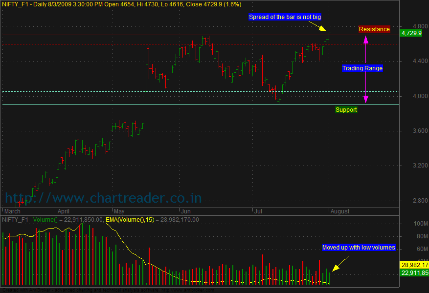 Nifty formed a Trading range from last 2 months, yesterday it broke out of the range, but the volumes and the spread of the bar are not convincing. Need to be cautious with taking up immediate long positions.