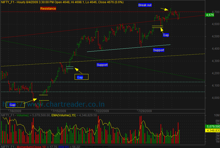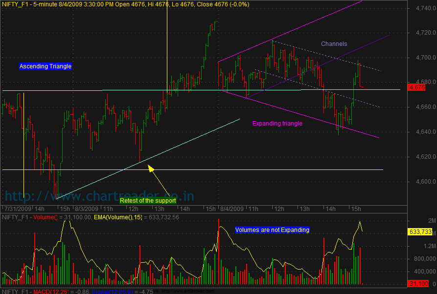 On 3rd Aug Nifty broke above the trading range but with very low volumes, also it formed an Ascending triangle in intraday basis target for which is 4760 levels.