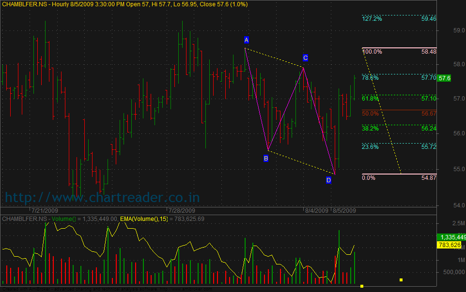 In the Chambal fert case, Fibonacci convergence has occurred at 54.80 levels, which is very near to our triangle breakdown price. So we move the trade trigger price below the Fibo level, that is at 54.50 level, and put the stoploss order at 55.90 levels. In this case price reversed from the pattern and stop loss order gets triggered and took the profits at 1st and 2nd targets of the ABCD pattern that is at 57.10 and 57.70 levels.