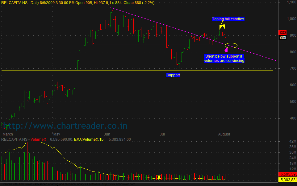 Relcap is moving in sideways from past 3 days, after touching the support line. It broke the pivot highs on intraday basics but later it broke the support line as shown in the charts. Which is not good indication I exited my last 25% of my holdings at 890 levels.
