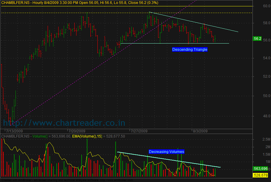 Chambal fert is formed a Descending Triangle, Volumes are also declining. Break down may give Rs3.5, it may move up to 51.5 levels