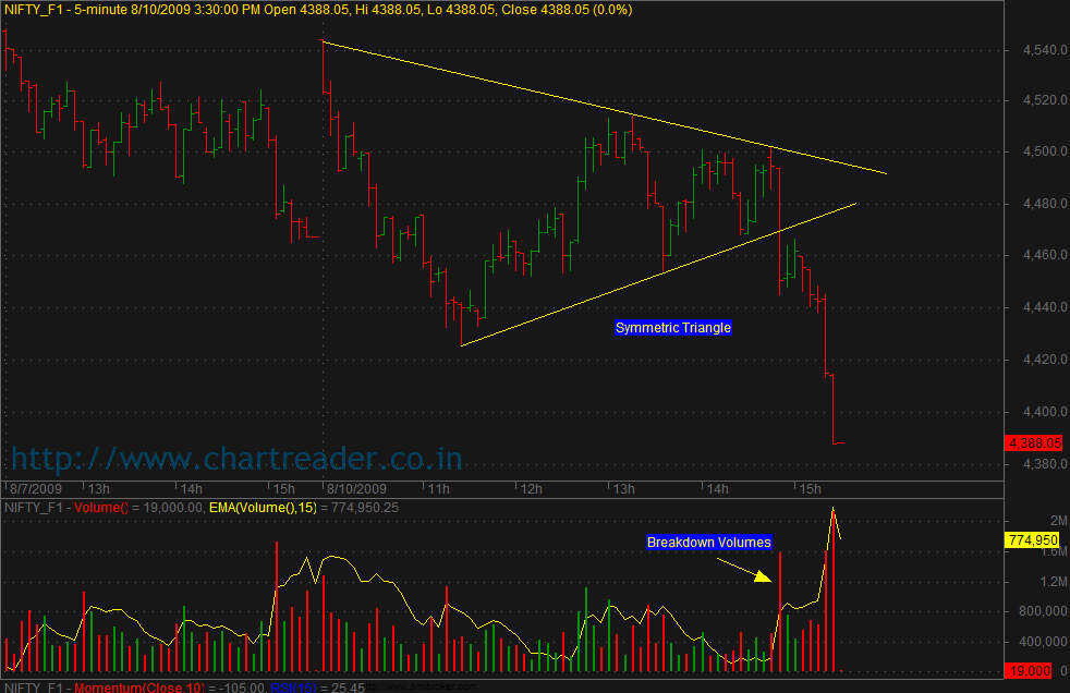 Nifty Opened gap up but it drifted down from the opening, showing weakness. It formed a symmetric triangle and gave breakdown in the last half hour. It reached the first target and almost reached the second target.