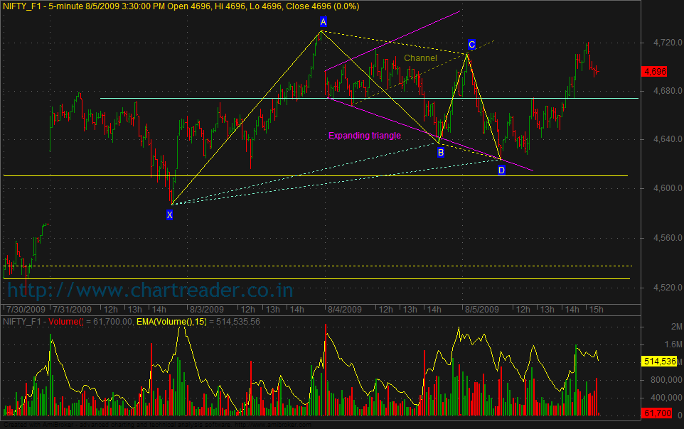 Nifty retraced exactly from 78% from the high of 3rd Aug to yesterdays low 4638 also it the support line of the channel gave resistance it drifted down to 127% forming a Bullish Gartley pattern(Formed with perfect Fibonacci ratios. Symmetry is not good, but it followed harmonic pattern in time intervals). Also the support line of the Expanding triangle gave support for it to move the prices up. First target for this pattern is reached yesterday itself.