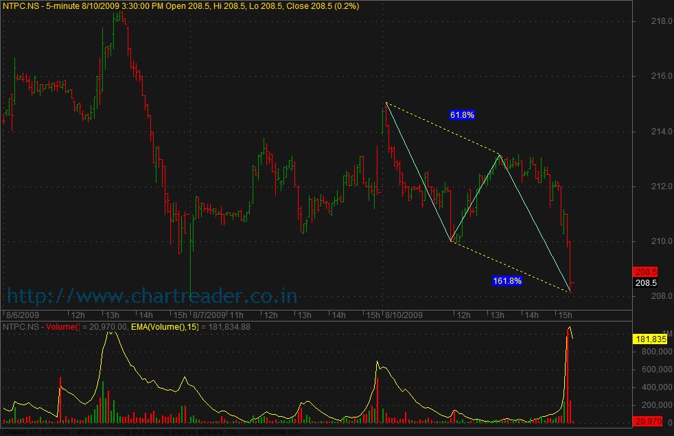NTPC formed an AB = CD pattern in intraday charts. yesterday it closed at 161.8%, still there is no indication of reversal. Today if it gives any reversal signal with out breaking yesterdays low, then long trade can be taken.
