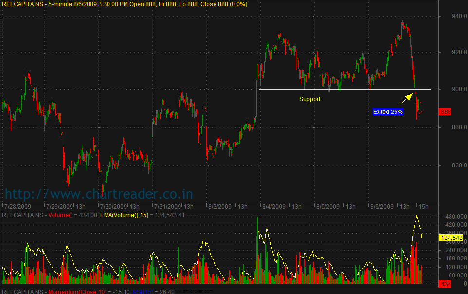 Relcap is moving in sideways from past 3 days, after touching the support line. It broke the pivot highs on intraday basics but later it broke the support line as shown in the charts. Which is not good indication I exited my last 25% of my holdings at 890 levels.